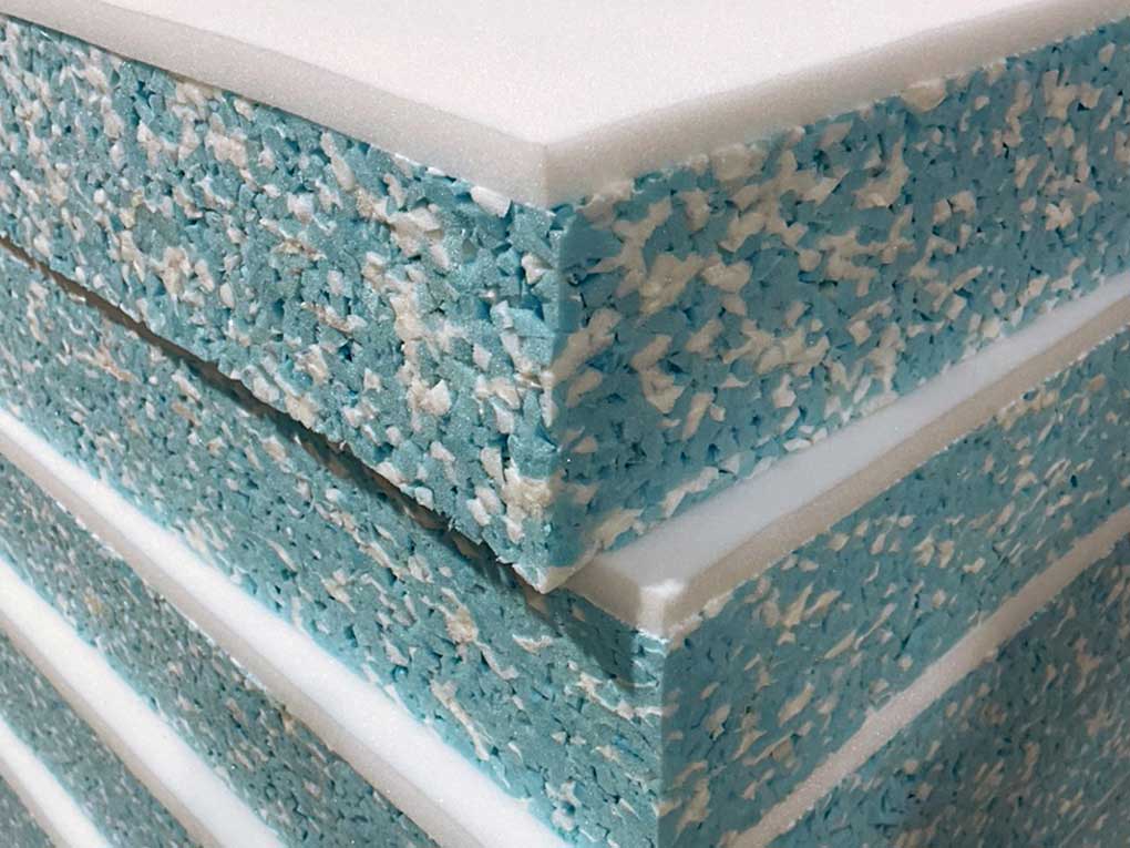 The waste generated from materials processing is selected and sorted by material type, and then agglomerated using certified and completely non-toxic prepolymer adhesives. From the “mixtures” so obtained, we create foam sheets having different carrying capacities for many applications, i.e. the bedding sector (mattresses), insulation, the sound-absorbing material industry, and so on.